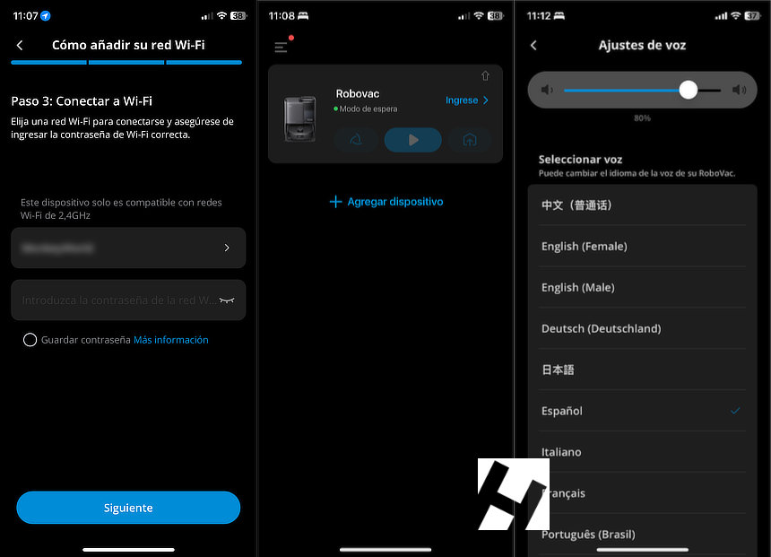 Añadir el dispositivo en la app es realmente sencillo. Todo el proceso está guiado y tan sólo tuve que añadir la contraseña de la WiFi, el resto es automático. Una vez añadido el dispositivo, se nos indica si queremos cambiar el idioma del robot; esta pregunta me dejo perdido. Pronto descubrí que el robot habla y las voces están disponibles en distintos idiomas. Básicamente la voz permite indicar la acción o el estado en el que se encuentra el robot. Una funcionalidad muy útil para personas mayores, que muy probablemente no gestionen el dispositivo desde la app.