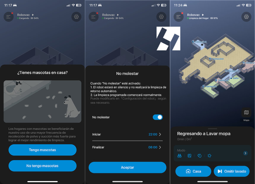 Llega el momento del primer recorrido, pero antes de limpiar el robot necesita realizar un mapa de nuestro hogar. La aplicación nos guía por este proceso de forma sencilla. Nos indica una serie de recomendaciones para mejorar la limpieza del robot y también nos preguntará por si tenemos o no animales y las horas en las que nos queremos que el robot funcione. Y voila, el robot se pone manos a la obra con las tareas.