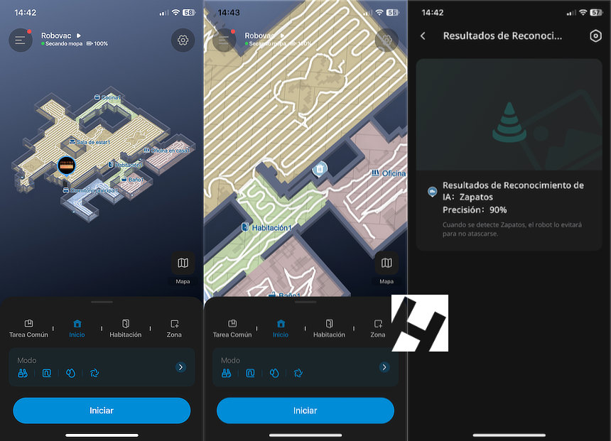 El mapa lo realizó en menos de 5 minutos y la verdad que es bastante fiel a la realidad. Tan sólo hay una pared que no aparece correcta y entiendo que en el futuro se dará cuenta y acabará añadiéndola. Pero lo mas importante es la limpieza y esta la realizó de forma inmejorable. Se nota diferencia entre un robot que solo «barre» y el Omni E25, con su función de mopa. Es suelo queda bastante mas limpio y gracias al jabón la limpieza también se huele. Debajo os dejo del último uso, donde ha detectado unas zapatillas en un dormitorio o cables eléctricos. Todo esto se realiza gracias a su función de IA y sus cámaras RGB.