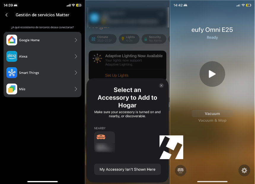 Otro aspecto novedoso es el soporte para Matter. Convirtiéndose en el primer robot de eufy con soporte para este standard. En mi caso lo he enlazado con Apple Homekit y ahora por ejemplo, dispongo de la posibilidad de lanzar la tarea de la limpieza cuando se realice la automatización de salir de casa. Gracias a Matter podemos añadirlo a Alexa, Google Home, Home Assistant, Homey… También es posible desde esta versión utilizar los atajos de Siri. Utilizando comandos como «Comienza la limpieza» o «Limpia la cocina».