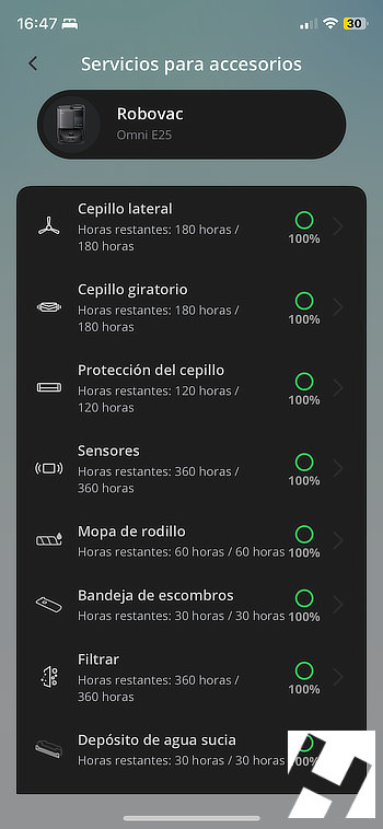Por último comentar una opción dentro de «mas configuraciones», que nos permite conocer el estado de cada accesorio. Habitualmente se nos olvida realizar un mantenimiento adecuado de los aspiradores y casi siempre es por no recordar cuando fue la última vez que se limpió un filtro o un cepillo. eufy Clean contabiliza las horas de uso de cada componente y podemos controlar de forma sencilla el estado de cada parte del robot y la estación de carga.