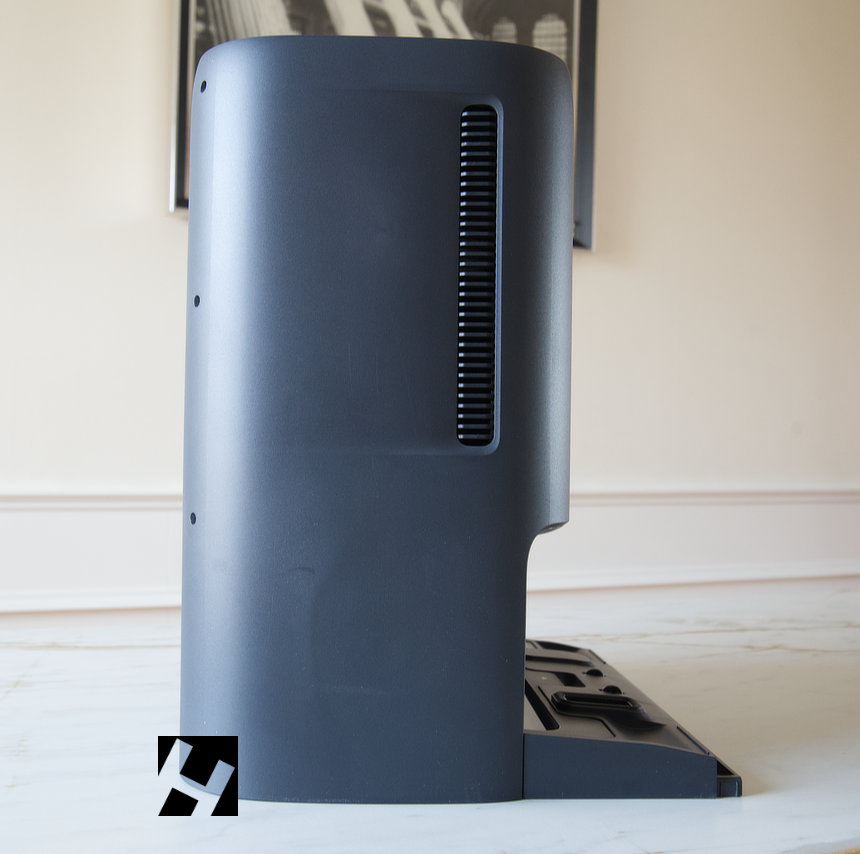 La zona lateral y trasera muy parecida a la base. En los laterales incorpora unas rejillas para sacar el aire de la aspiración. Mientras que en la trasera se encuentran los conectores de agua, electricidad y residuos sólidos.