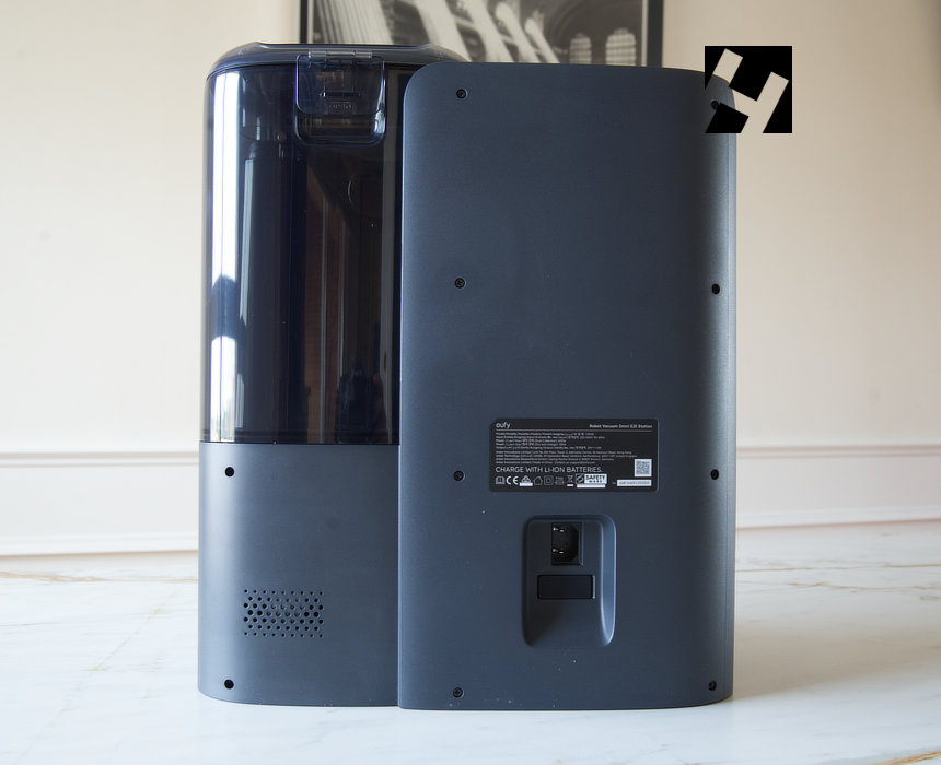 En los otros lados a destacar las rejillas, las cuales se utilizan para sacar el aire cuando se absorbe la suciedad del depósito del robot al depósito de la base (rejilla lateral) y cuando se seca la mopa del robot (rejilla trasera). La toma de alimentación va en la trasera del equipo y usa un cable standard de alimentación.