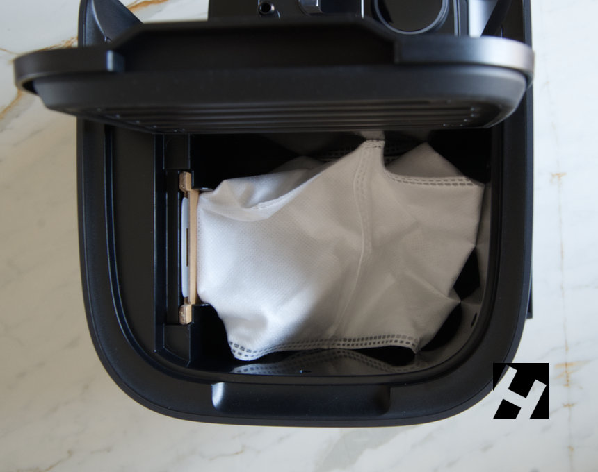 Como cualquier otro aspirador, ya sea robot o de mano, incorpora una bolsa de almacenaje para la suciedad. Esta bolsa está situada en el lado izquierdo, visto de frente. Para acceder a la misma hay que abrir la tapa superior.