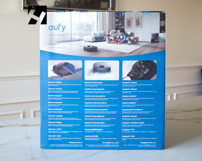Como era de esperar nos encontramos ante una caja de gran volumen y pesada, aproximadamente 18Kg. La caja es claramente visual y muestras las principales características del robot con imágenes del robot en acción. Como no, el color azul predomina, el mismo del logo de eufy. Para el usuario es muy atractivo y es precisamente lo que busca para diferenciarse de otros robots situados en los lineales de venta.