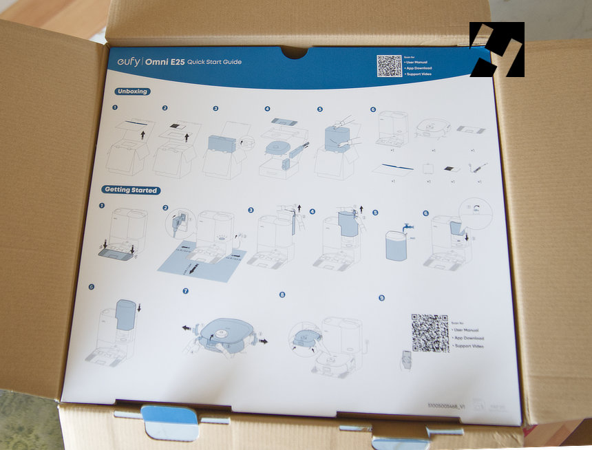 Nada mas abrir la caja encontramos las instrucciones básicas para el unboxing y la puesta en marcha. Como se aprecia en la imagen, no es necesario montar nada, la base y el robot vienen completamente montados.