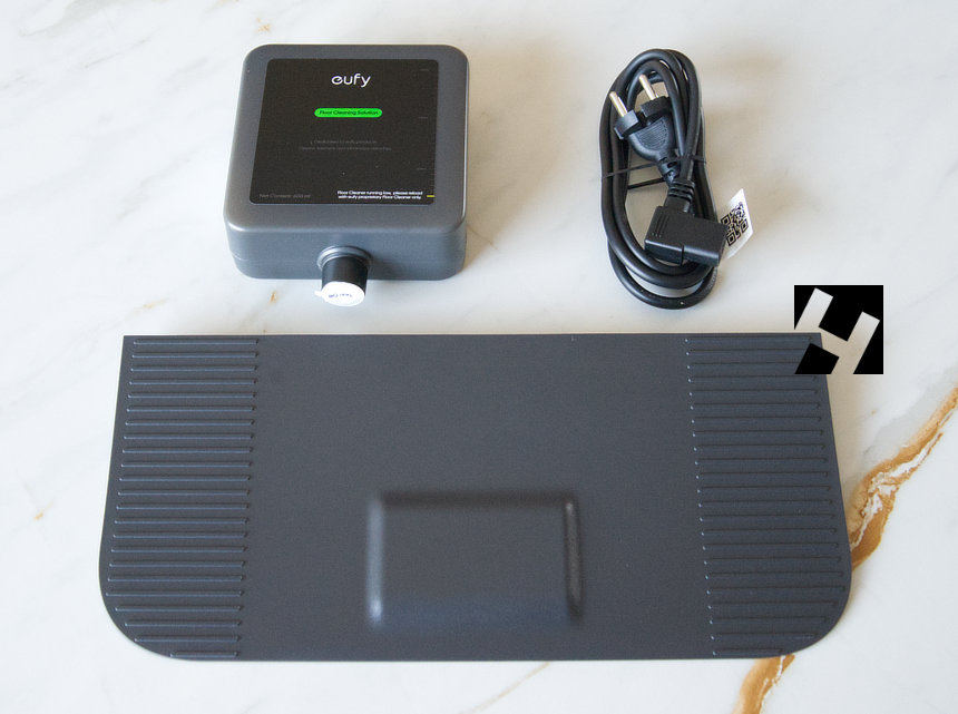 El resto del contenido del paquete esta formado por la rampa de subida/bajada para el robot, un deposito de jabón y cable de alimentación de la estación de carga. El deposito de jabón es necesario cambiarlo cuando este se agota y es el mismo modelo utilizado para el S1 Pro. Tiene un coste de 20 euros y sinceramente no he encontrado su duración en número de lavados o m2. Como en todo producto electrónico se incorpora una guía de seguridad para el uso del dispositivo.