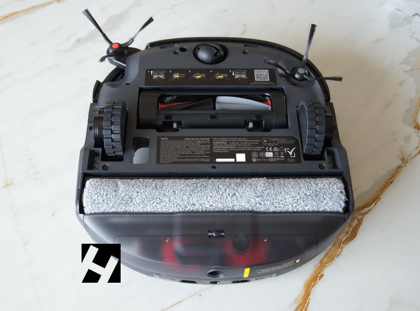 Y vamos con la zona mas interesante y que ayuda a entender el funcionamiento del robot para un neófito en la materia. En la trasera el Omni E25/E28 incorpora el depósito de agua. Seguida va la mopa blanca grisácea que se encarga de distribuir el agua para el suelo. A los laterales las ruedas motrices y regulables de forma automática en altura. En el centro los cepillos DuoSpiral™, diseñados para evitar que el pelo se enrede y reducir la frecuencia de mantenimiento. Y en la punta la rueda de dirección del robot. Como veis no es tan complejo como puede parecer a primera vista.